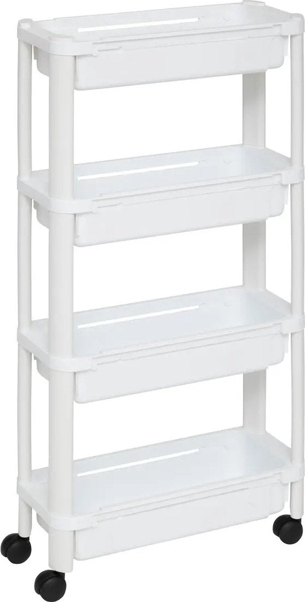 Chariot de rangement étroit de cuisine/salle de bain 5Five avec 4 étagères/paniers/corbeilles. Dimensions : L37 x l15 x H79 cm. Couleur : blanc. Matériau : plastique PP. Ce chariot est facilement amovible (système de clic) afin de prendre moins de place. Le chariot est équipé de roues et dispose de 4 niveaux de paniers avec bord relevé. Utilisez le chariot dans la cuisine ou la salle de bain pour ranger des articles. Un incontournable pour chaque foyer.