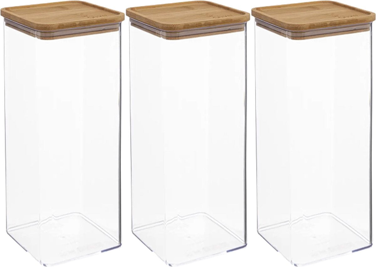 Lot de 3 bocaux de conservation alimentaires, pratiques et jolis, en plastique avec couvercle en bambou. Contenance : 2000 ml. Convient pour conserver les aliments longtemps. Couvercle hermétique. Dimensions : 10 x 27 cm. Disponible dans de nombreux formats. Série : Berlino.