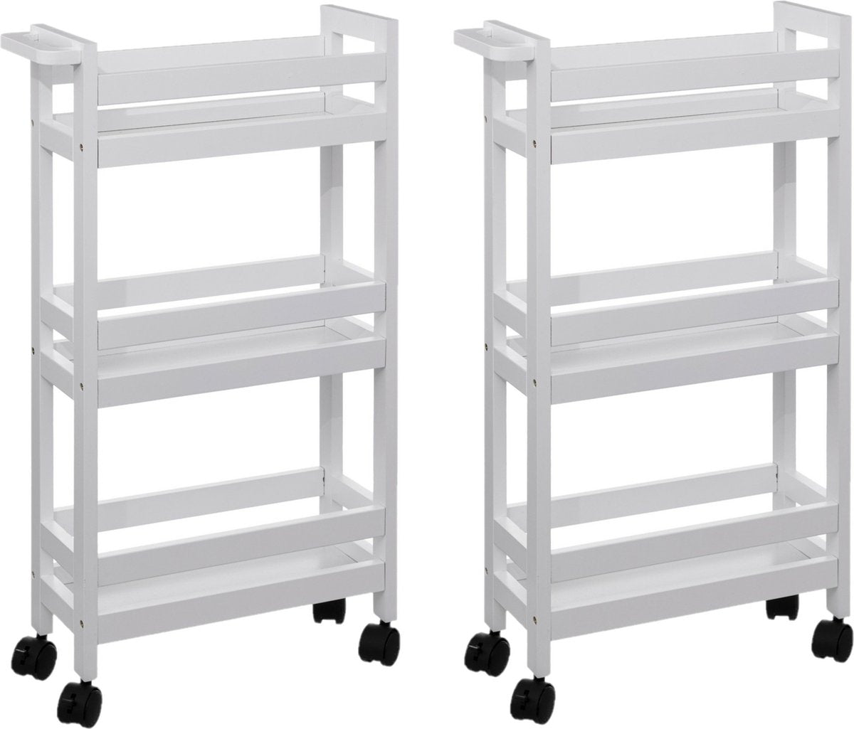 Lot de 2 chariots de cuisine ou de salle de bain étroits à 3 niveaux où vous pouvez ranger toutes sortes de produits et/ou d'ustensiles de cuisine. Vous pouvez également utiliser ce chariot dans la salle de bain pour ranger, par exemple, du gel douche et du shampoing, ou dans le salon comme meuble à boissons. En bref, de nombreuses utilisations possibles. Ce chariot roulant a une taille d'environ P15 x L40 x H75 cm. Couleur : blanc. Matériau : bois MDF. La capacité de charge maximale est de 2 kilos par niveau. Vous devez le monter vous-même. Attention, c'est un chariot étroit, mais super pratique. Poids du colis 14,5 kilos.