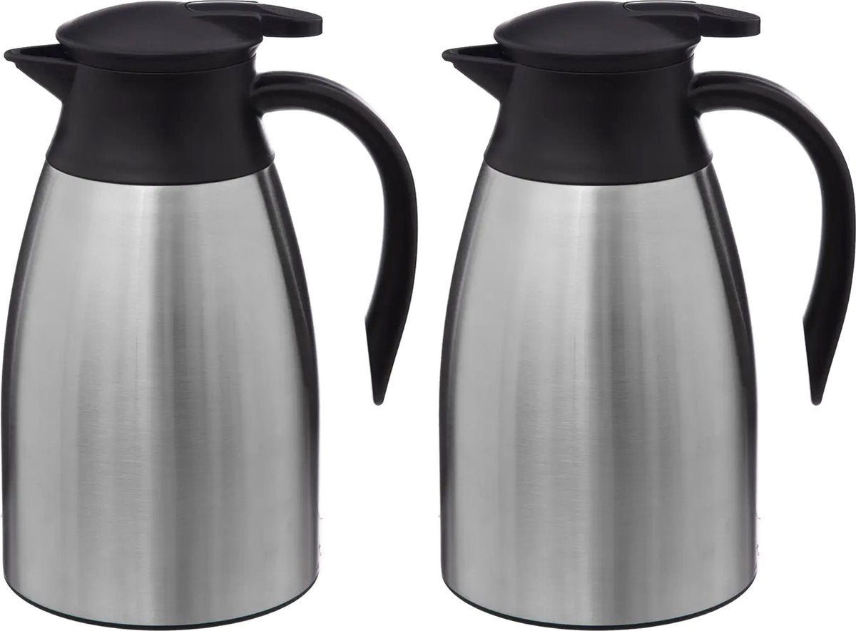 Gardez vos boissons au chaud ou au froid pendant longtemps avec cette bouteille thermos à double paroi de 5Five. Le pichet isolant est doté d'un bouchon à vis hermétique et anti-fuite. Le pichet est facile à utiliser avec sa poignée et son bouton poussoir. Grâce à ses bonnes propriétés thermiques, les boissons chaudes restent chaudes pendant 10 heures et les boissons froides restent froides pendant 20 heures. Idéal pour les déplacements. Ne convient pas au lave-vaisselle. Lot de 2 pièces.