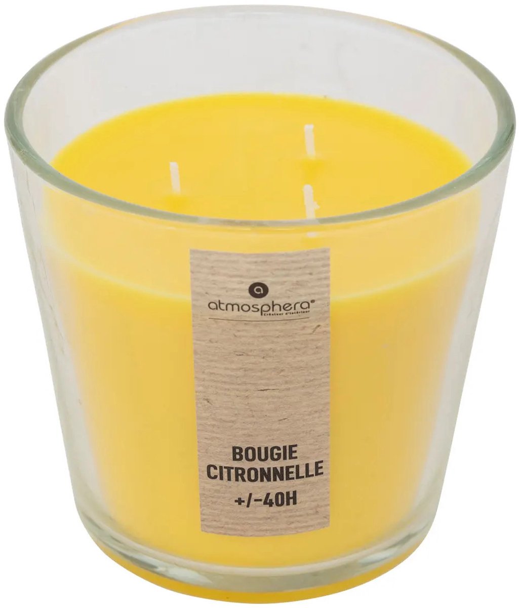 Créez une atmosphère chaleureuse et accueillante dans votre maison avec cette grande bougie parfumée au délicieux arôme de citronnelle, de couleur jaune. Coulée dans un support en verre transparent, avec 3 mèches, cette bougie diffuse un parfum qui éveille vos sens. La citronnelle a un fort parfum de citron ou d'agrumes.