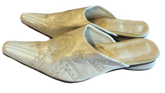 Jolie babouche marocaine faite main en cuir, fabriquée à partir de cuir souple et ornée de motifs. En savoir plus