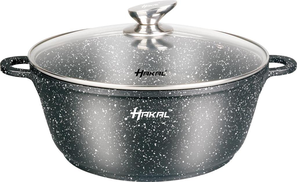 Cette cocotte Hakal Line a 3 couches de revêtement en marbre et est fabriquée en aluminium moulé. Cette cocotte robuste est fabriquée à partir de matériaux de très haute qualité et convient à toutes les sources de chaleur.