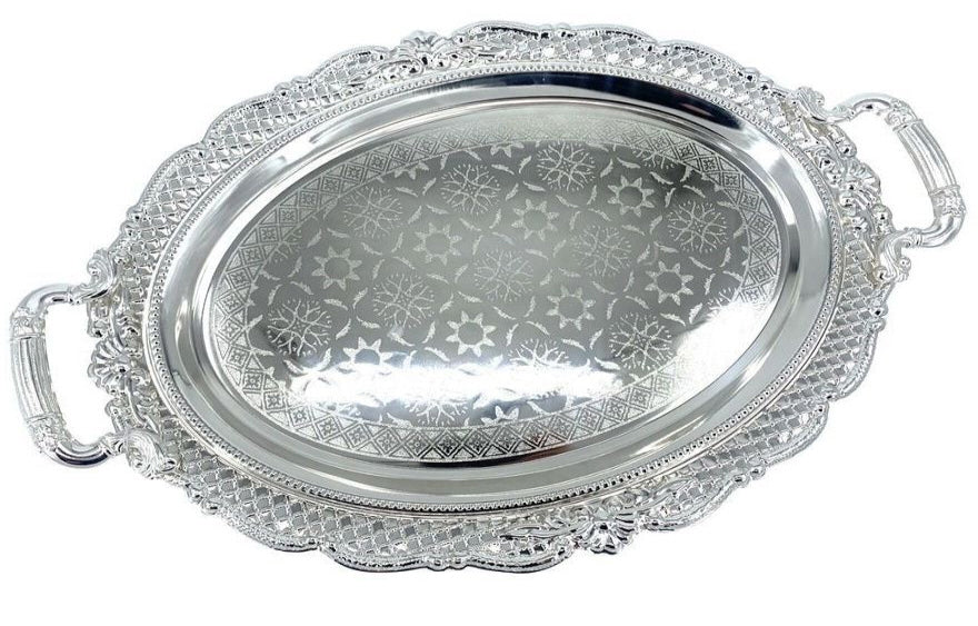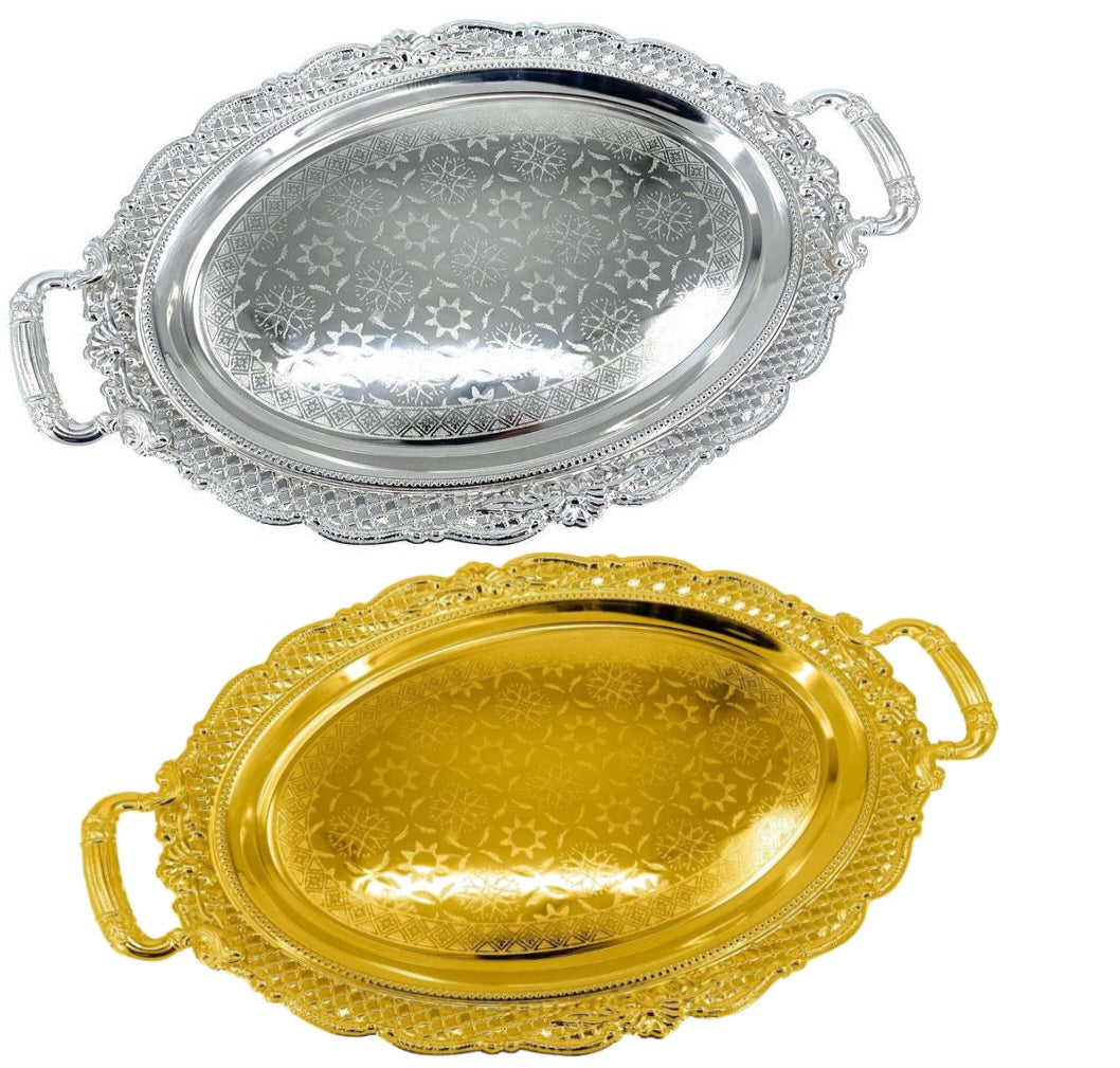 Un plateau ovale avec motif découpé sur les bords, disponible en argent ou en or. Dimensions : 52 x 42... En savoir plus