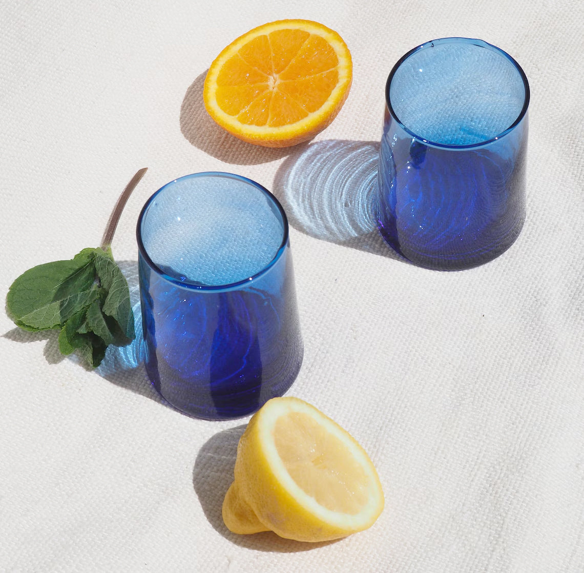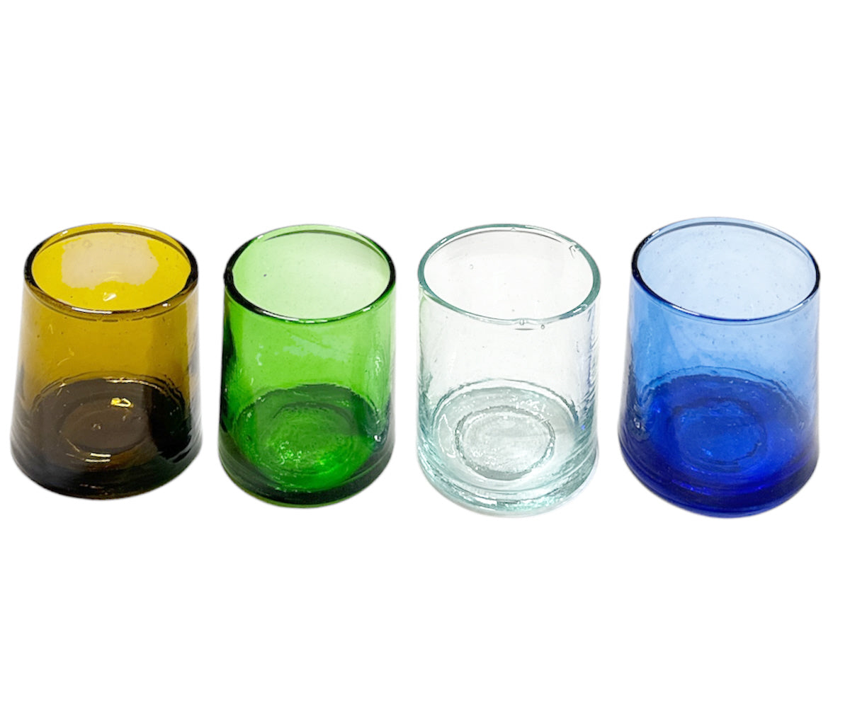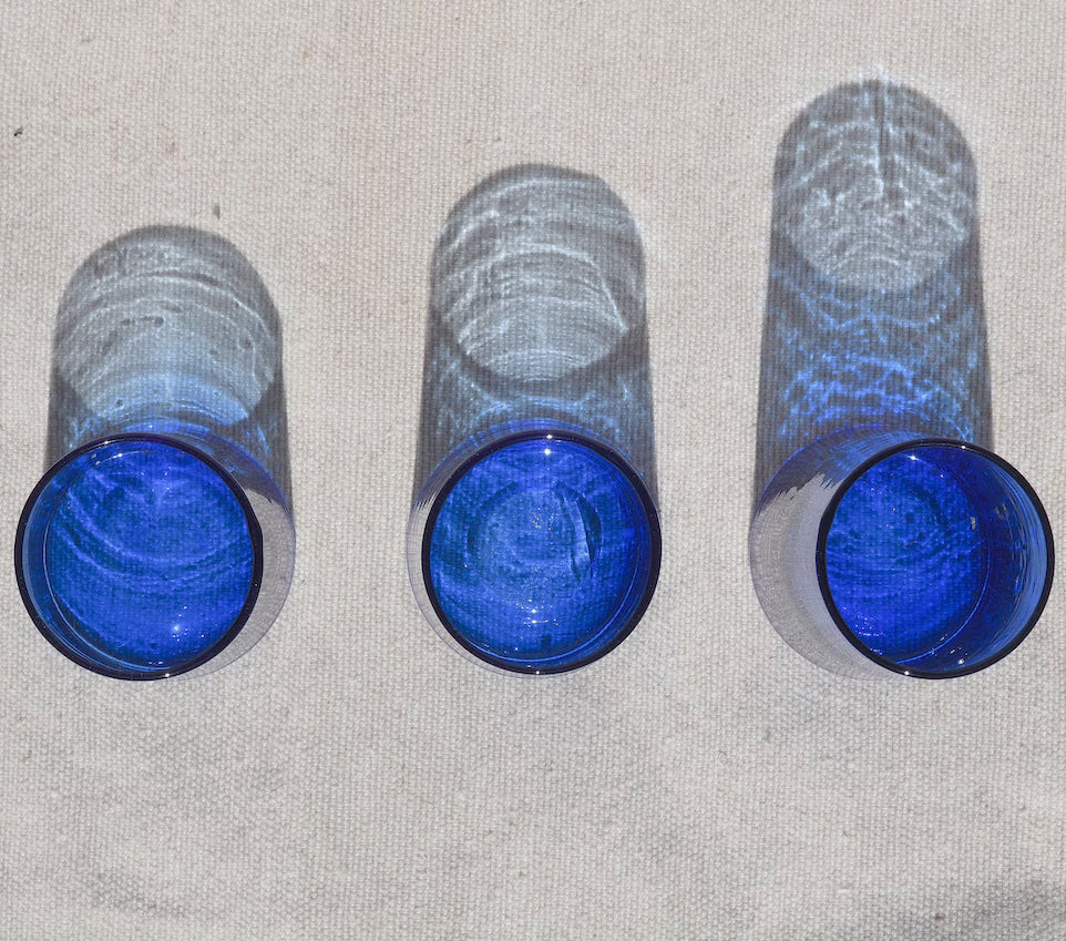 Ces magnifiques verres Naqa faits main du Maroc sont fabriqués à partir de verre recyclé et dégagent une lueur bleu-vert unique. Chaque verre est soufflé à la main par des maîtres verriers expérimentés, ce qui se traduit par de subtiles imperfections et de petites bulles d'air qui soulignent le caractère unique de chaque pièce.
