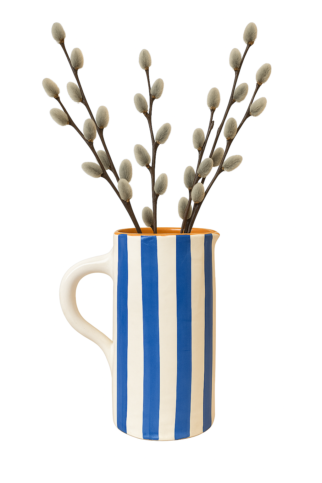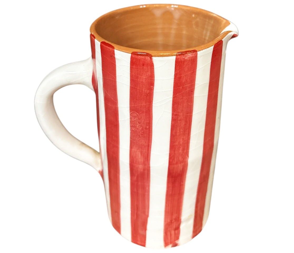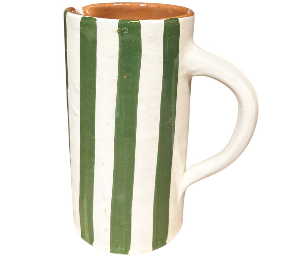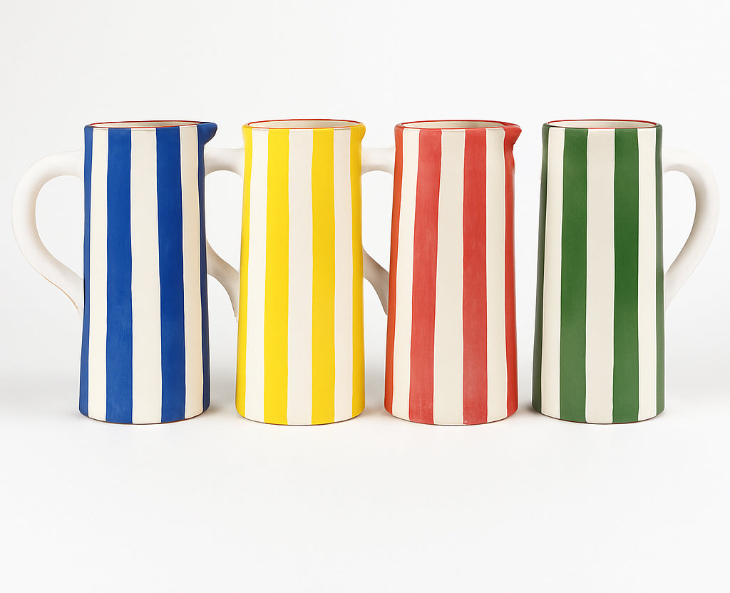 Apportez de la couleur et du caractère à votre intérieur avec cette élégante carafe en céramique faite à la main. La carafe est fabriquée à la main et présente des rayures verticales dans un style rétro ludique. Idéale comme carafe à eau, vase à fleurs ou pièce décorative frappante. Le design est à la fois pratique et esthétique, avec une poignée confortable et une forme cylindrique robuste.