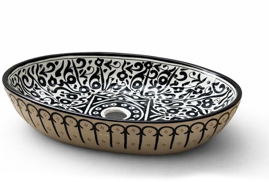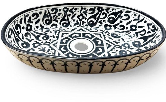 Geef je badkamer een frisse en stijlvolle upgrade met deze handgemaakte Marokkaanse ovale waskom in zwart-witte uitvoering. Het verfijnde, handgeschilderde patroon aan de binnenzijde zorgt voor een levendige en authentieke uitstraling, terwijl de warme aardetint aan de buitenzijde een mooie balans creëert.