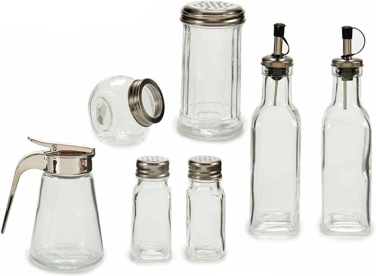Vivalto - Service de table en verre 7 pièces. 2 distributeurs d'huile 200 ml, 2 salières 79 ml, 1 saupoudreur... En savoir plus