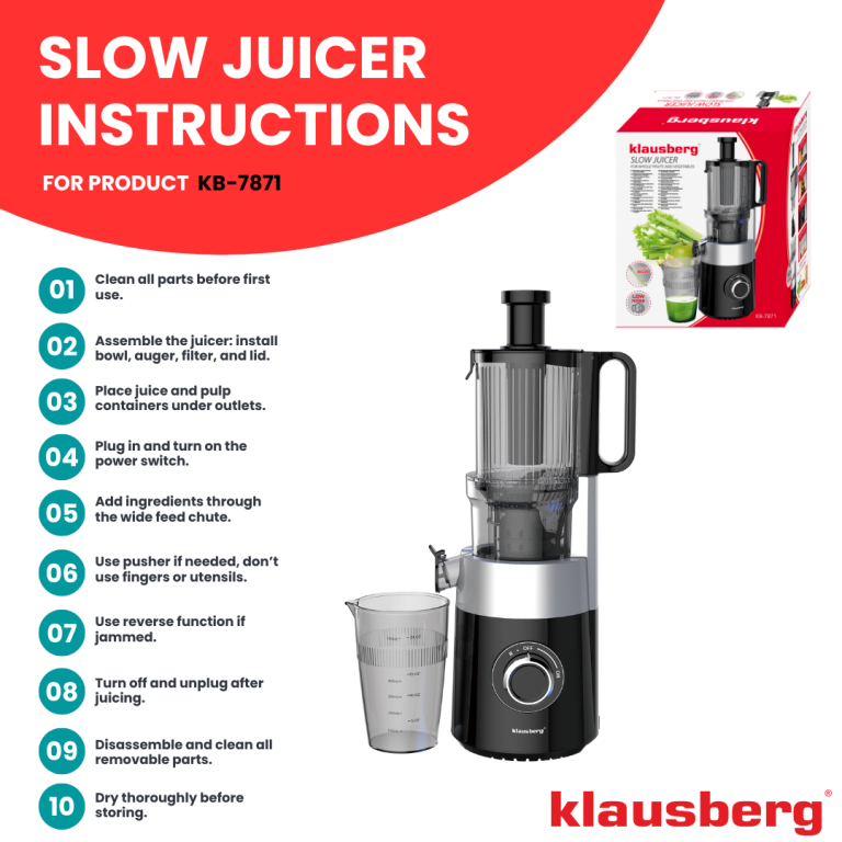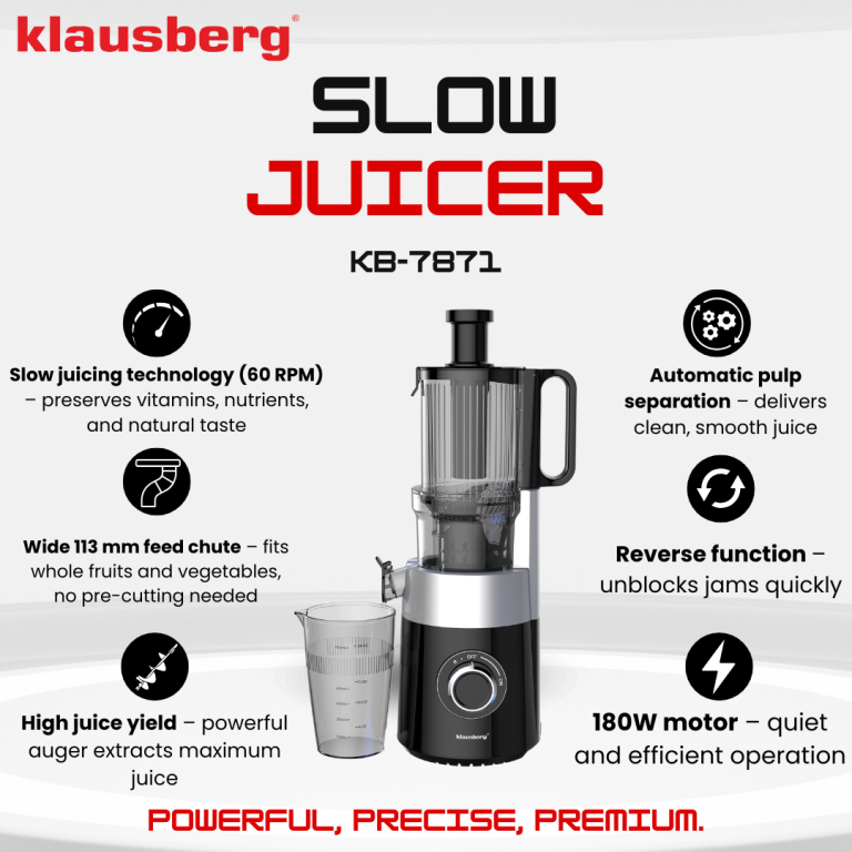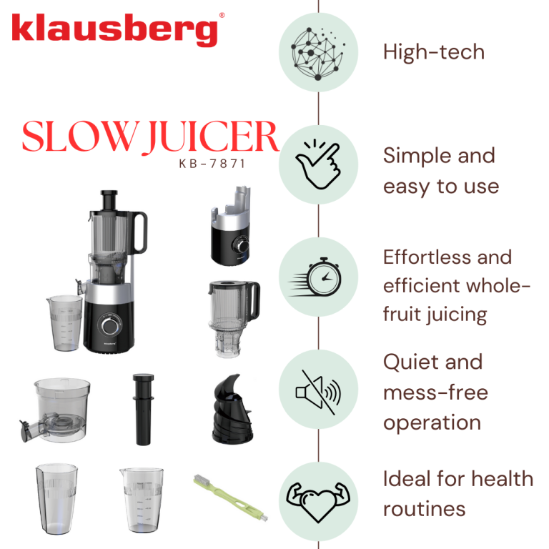 Choisissez le KB-7871 de Klausberg – l'extracteur de jus lent fiable qui allie parfaitement votre santé, votre commodité et votre style de cuisine. Commandez dès aujourd'hui et commencez votre journée avec une énergie pure.