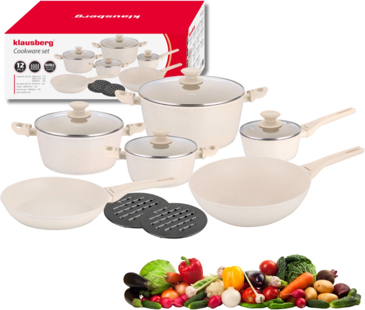 Optez pour un ensemble complet capable de relever tous les défis culinaires. Le Klausberg KB-7959 est une batterie de cuisine de 12 pièces dotée d'un revêtement antiadhésif en marbre durable, adaptée à toutes les zones de cuisson, y compris l'induction. Le corps en fonte d'aluminium assure une répartition rapide et uniforme de la chaleur. Les couvercles en verre trempé avec évacuation de la vapeur vous offrent un contrôle parfait pendant la cuisson. Les poignées ergonomiques "soft-touch" procurent confort et prise en main sûre, même lors de cuissons prolongées.