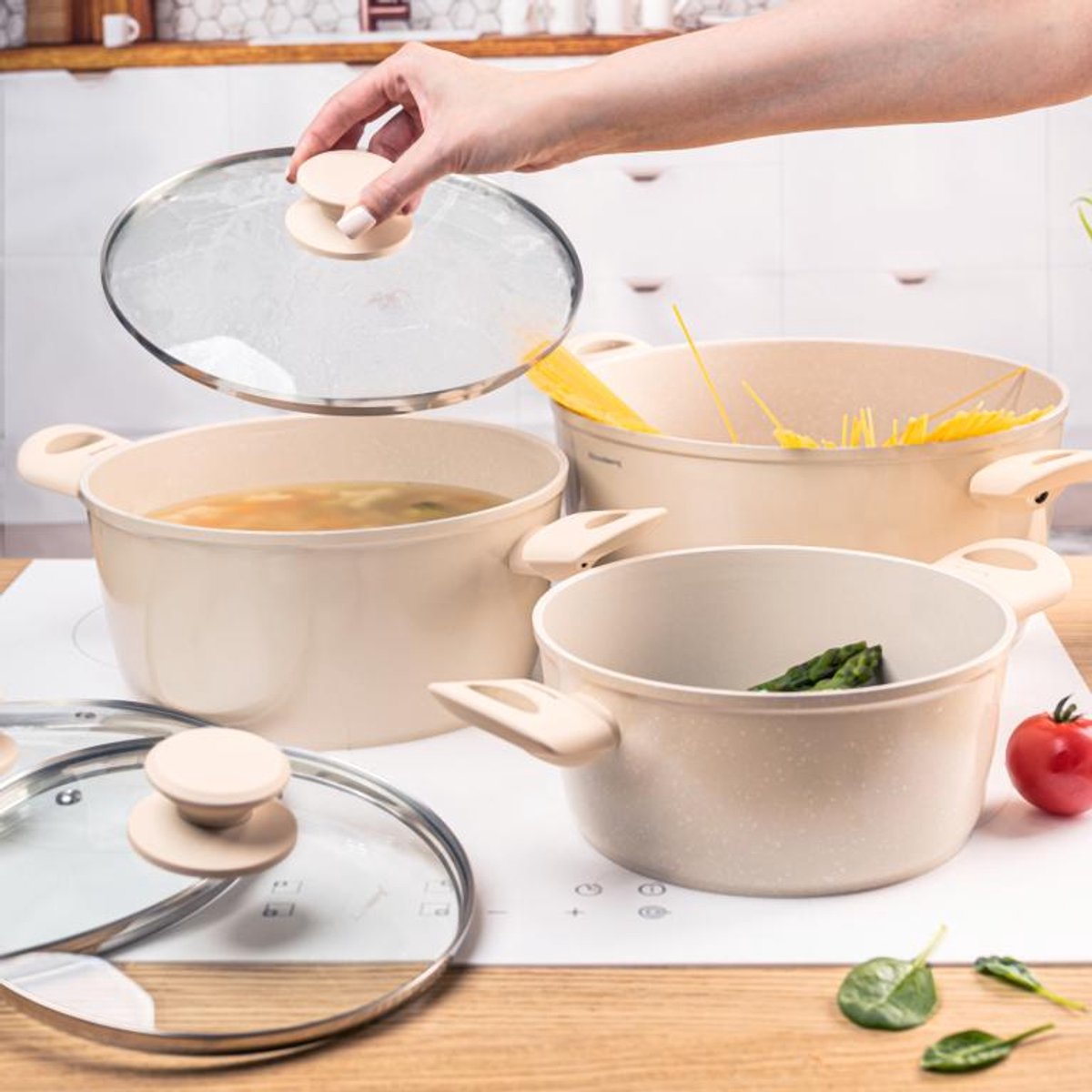 Le Klausberg KB-7961 est un élégant ensemble de casseroles de 6 pièces de couleur marbre beige moderne. Cet ensemble de 3 casseroles avec couvercles assortis est doté d'un revêtement antiadhésif en marbre de haute qualité pour une cuisson saine avec moins de graisse. L'aluminium moulé sous pression assure une répartition rapide et uniforme de la chaleur, ce qui permet d'économiser de l'énergie. Les couvercles en verre trempé avec sortie vapeur vous permettent de surveiller la cuisson. Les poignées confortables soft-touch assurent une prise en main sûre. Convient à toutes les zones de cuisson, y compris l'induction, et résiste au lave-vaisselle.