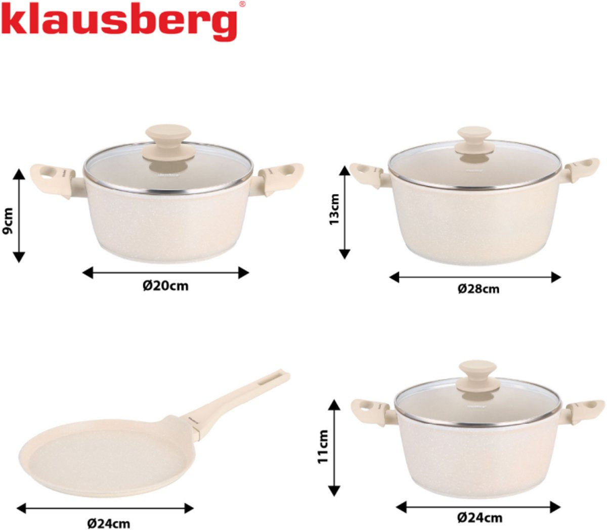 Le Klausberg KB-7963 est un ensemble complet de 7 ustensiles de cuisine dans une élégante couleur beige. Cet ensemble combine 3 casseroles avec couvercles et une poêle à frire de 24 cm pour toutes vos tâches de cuisson. Le revêtement antiadhésif en marbre permet de cuire et de rôtir avec moins de graisse et un nettoyage facile. Le fond à induction complet garantit une répartition uniforme de la chaleur et des économies d'énergie sur toutes les zones de cuisson, y compris l'induction.