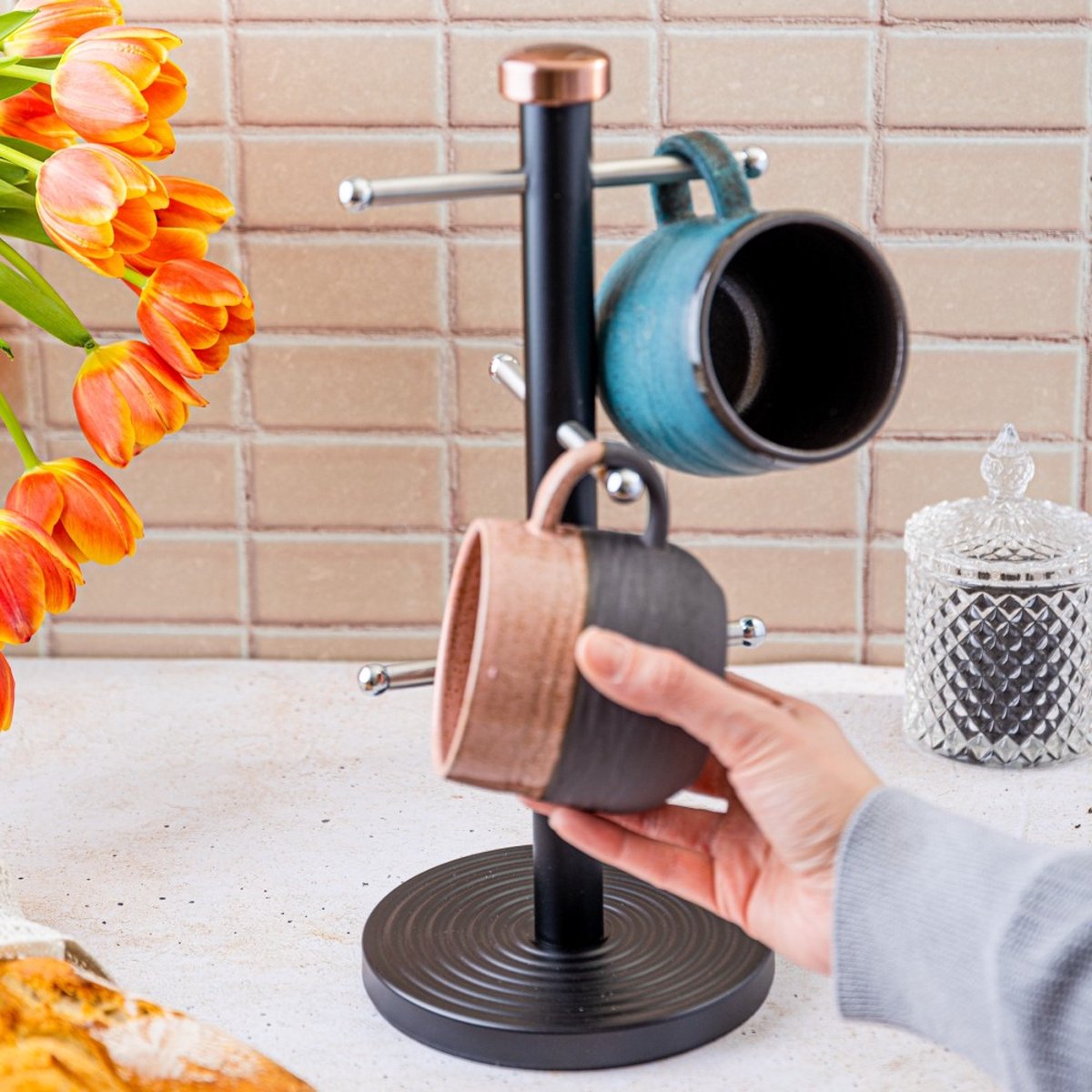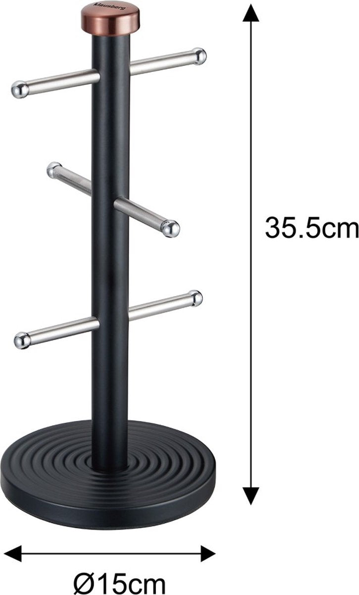 Si vous aimez profiter de votre première boisson chaude du matin quand vous êtes encore un peu endormi, vous serez ravi de l'espace de rangement pratique pour vos tasses, qui seront rapidement à portée de main. Avec notre arbre à tasses en acier inoxydable aux couleurs tendance, non seulement vous prenez rapidement votre tasse préférée, mais il est également très élégant et attire tous les regards dans chaque cuisine moderne. L'ustensile de cuisine élégant garantit que les tasses restent fermement en place et le design réfléchi permet de retirer les tasses et les mugs de manière optimale. L'arbre à tasses a une base ronde et solide avec une couche de mousse antidérapante en dessous. La construction de haute qualité assure une position sûre et ne laisse aucune rayure sur les surfaces sensibles. La base et la barre de maintien du porte-serviettes de cuisine sont en acier inoxydable et peuvent être facilement nettoyées si nécessaire.