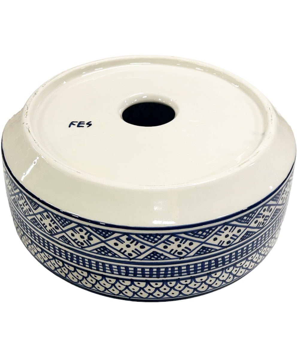 Offrez à votre salle de bain un look unique et exotique avec cette magnifique vasque marocaine fabriquée à la main, directement de la célèbre ville de Fès. Cet authentique lavabo rond, en céramique de haute qualité, ajoute une atmosphère chaleureuse à votre intérieur grâce à son charme oriental et à ses délicats détails peints à la main. Parfaitement adapté aussi bien à la cuisine qu'à la salle de bain, la vasque se combine magnifiquement avec une planche en bois ou en métal, ou même un meuble sous-vasque angulaire, offrant ainsi à votre aménagement créatif toute la liberté nécessaire.
