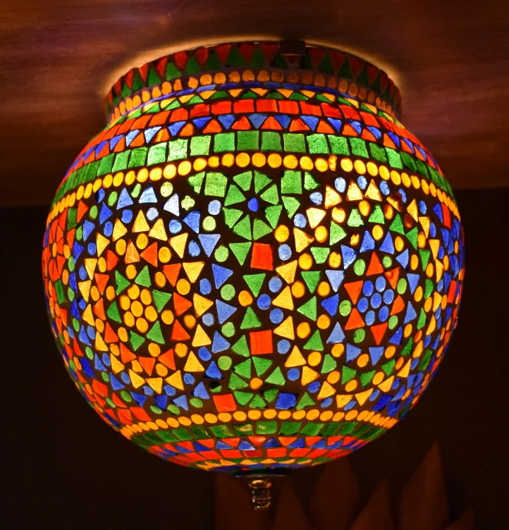 Donnez une atmosphère joyeuse à votre intérieur avec ce magnifique plafonnier mosaïque oriental, rempli de mosaïques de verre colorées et fini avec un joint blanc. Cette lampe mosaïque est fabriquée à la main en Inde.