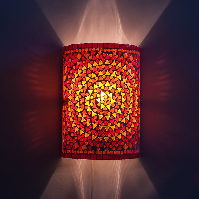 Magnifique applique murale orientale en forme de demi-cylindre de couleur rouge/orange, ouverte en haut et en bas. La lumière la traverse magnifiquement, notamment parce qu'elle est filtrée par la belle mosaïque de verre. L'applique murale rouge/orange est fabriquée à la main à partir de mosaïque de verre. Cette applique murale en mosaïque de forme cylindrique est composée de pierres de verre rouges et oranges incrustées dans un magnifique motif oriental.