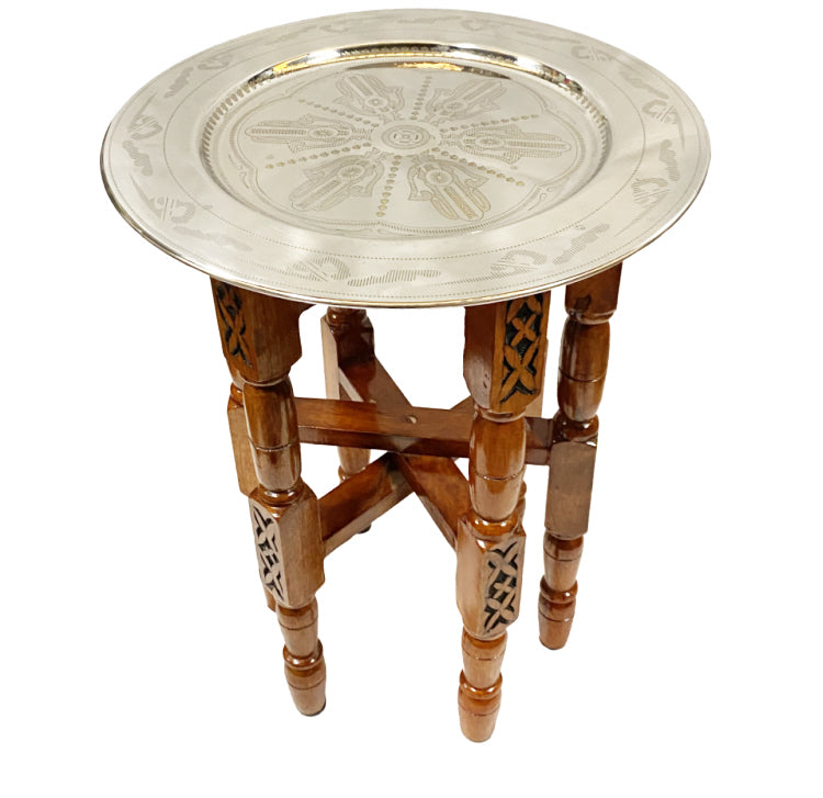 La table d'appoint est disponible avec un plateau en or et en argent. Le plateau est gravé à la main avec des motifs orientaux détaillés de la main de Fatima. La base en bois est pliable et facile à ranger.