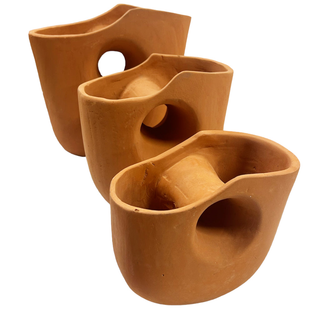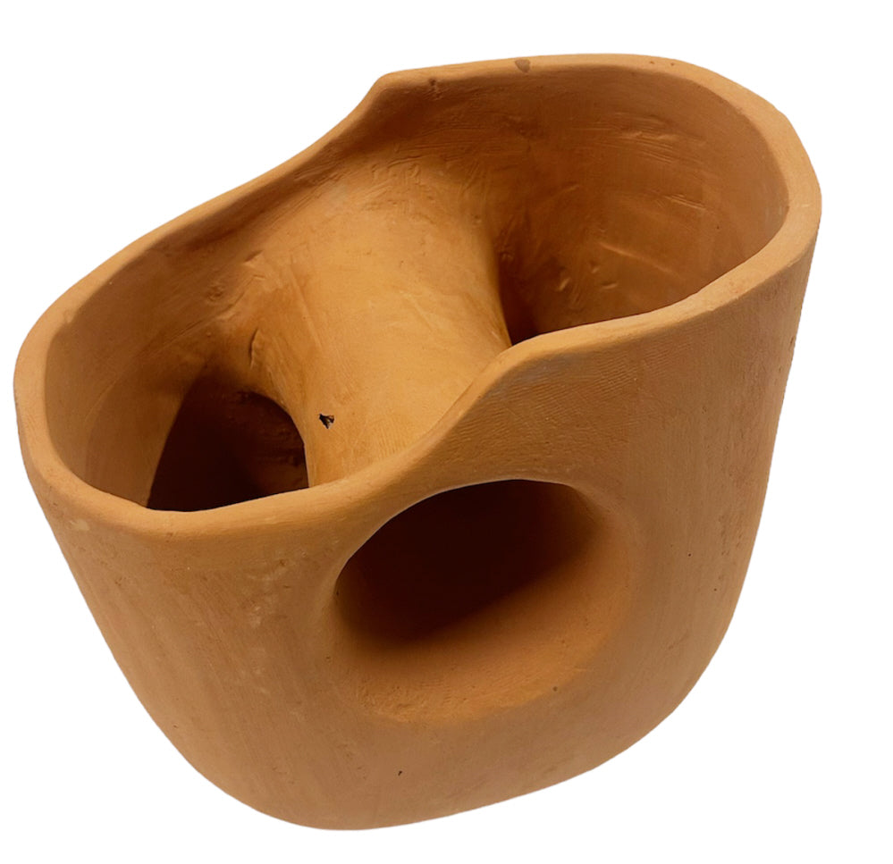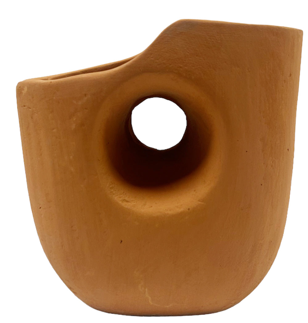 Ajoutez de la dimension et du style à l'espace avec ce vase abstrait marocain en terre cuite fait main de forme unique. Le vase est fabriqué à partir d'argile de terre cuite de haute qualité cuite à haute température, ce qui donne un vase robuste et stable. Le vase a un aspect contemporain, industriel ou minimaliste qui s'harmonise avec n'importe quel style d'intérieur moderne.