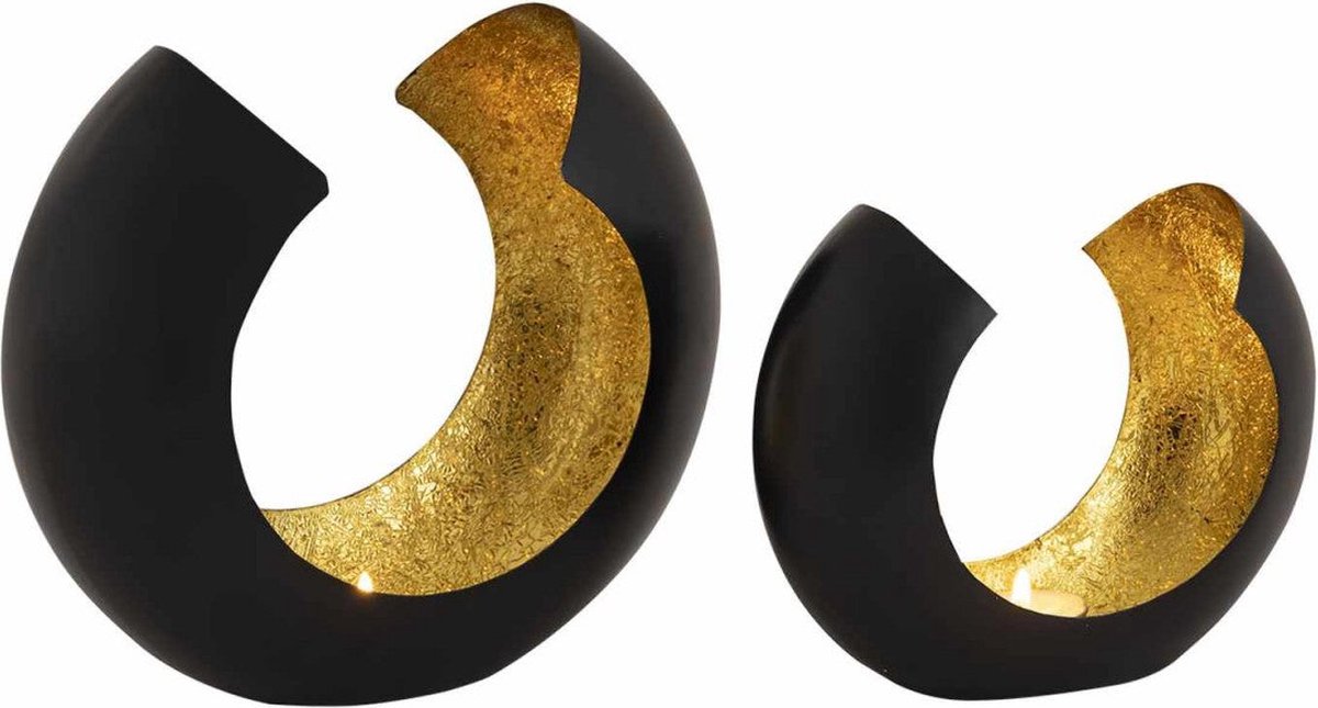 Lot de 2 bougeoirs en forme d'Omega, façonnés à la main à partir de tôle et laqués noir mat à l'extérieur. Les bougeoirs sont sublimés de l'intérieur avec une feuille métallique dorée, créant des effets de lumière dorés pour une ambiance chaleureuse.