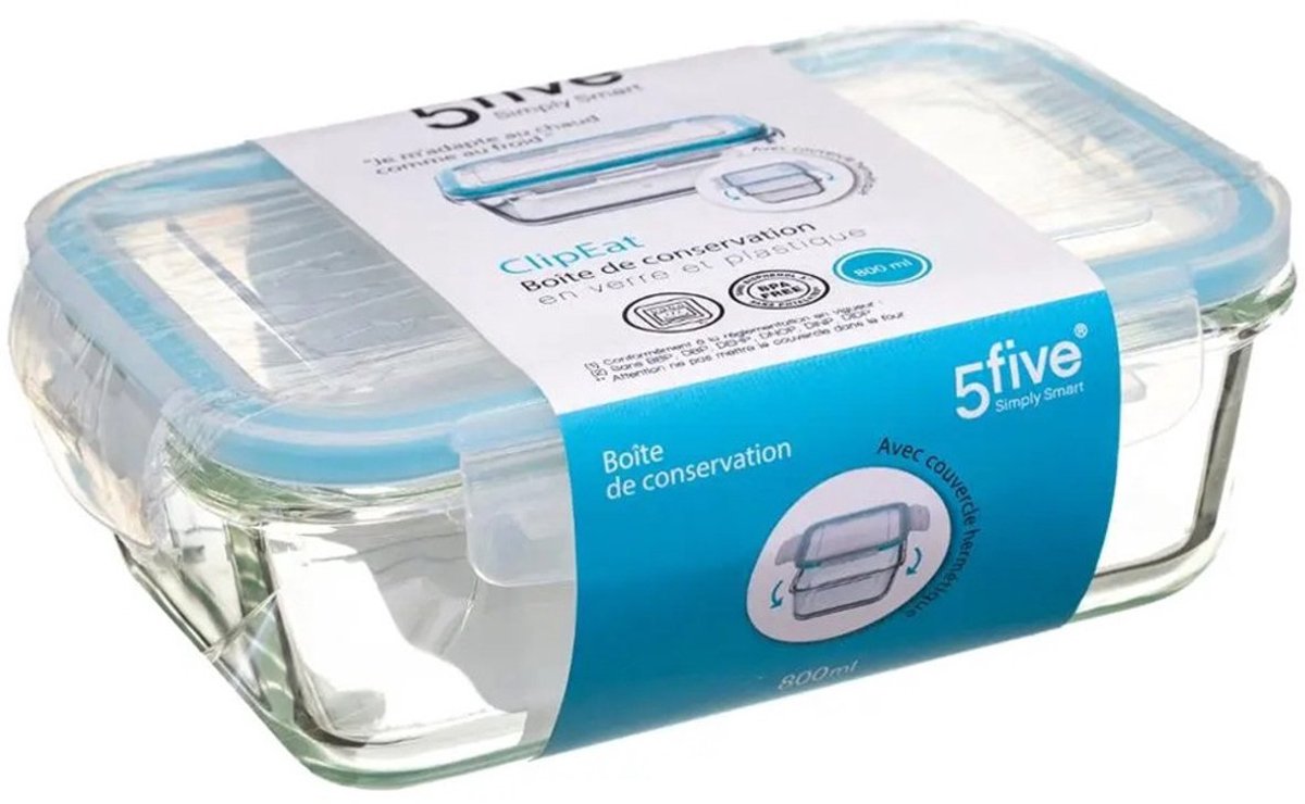 5x glazen lunchbox (inclusief deksel met lichtblauwe rand).