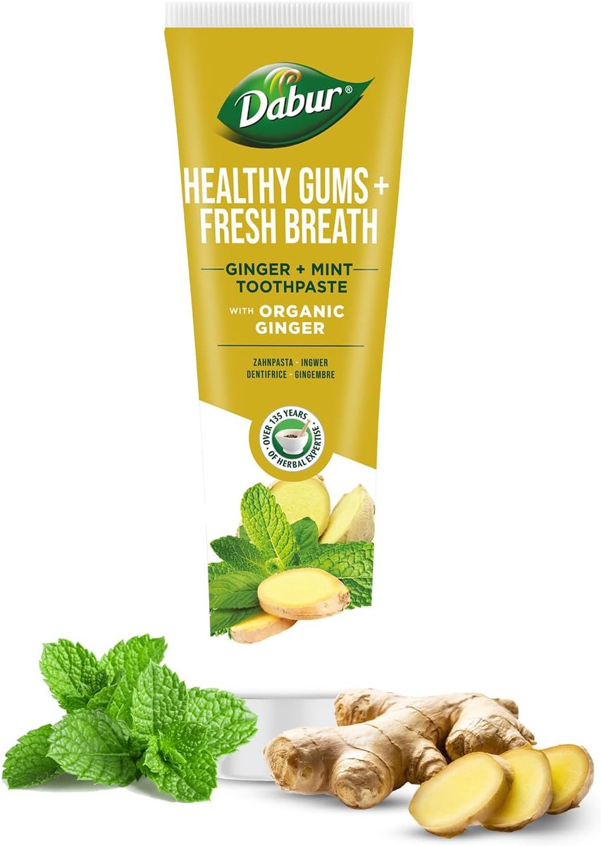 Le dentifrice innovant au gingembre et à la menthe de Dabur est un dentifrice à base de plantes sans fluorure contenant du gingembre et de la menthe biologiques, pour une expérience de brossage vivifiante et rafraîchissante et des soins bucco-dentaires complets avec des gencives saines et une haleine fraîche.
