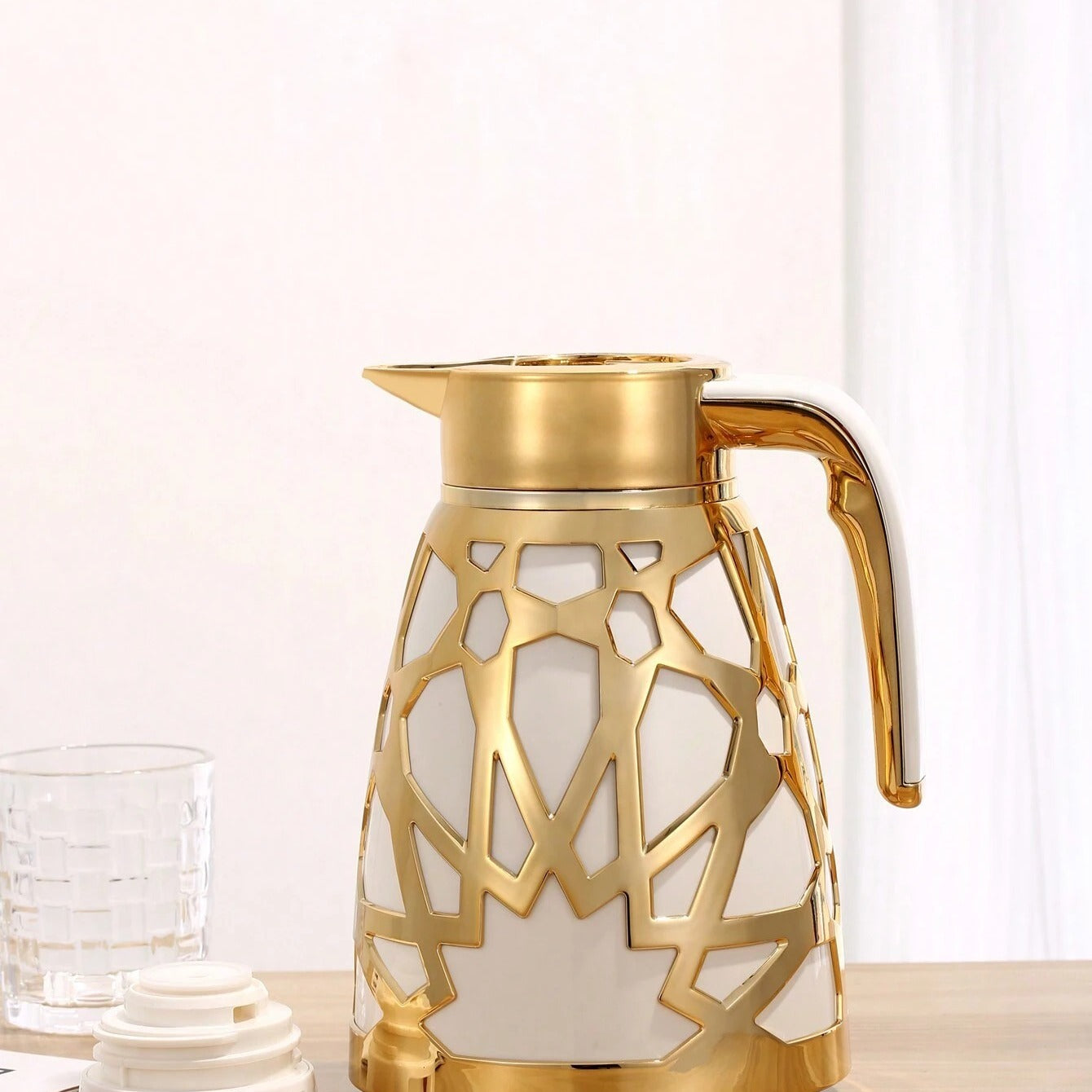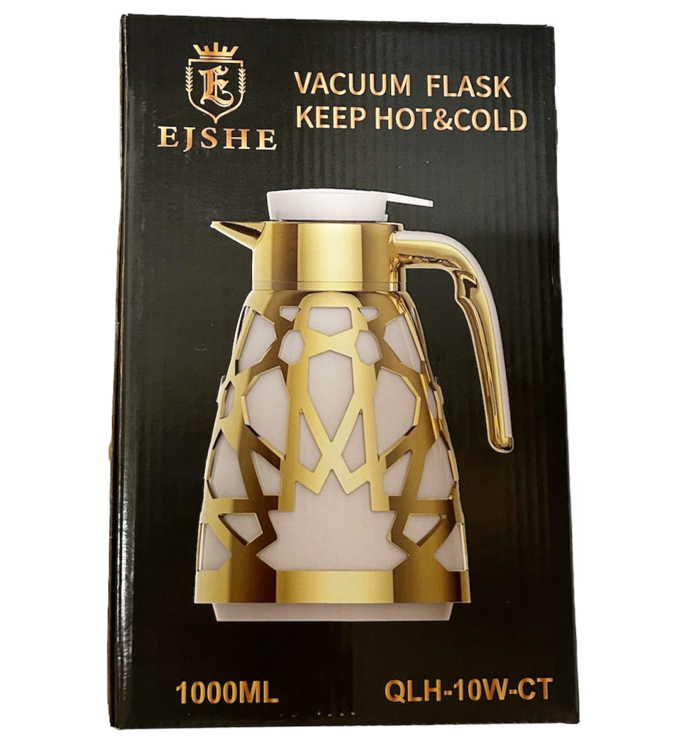 La verseuse thermos dorée orientale (1000ml) avec bouton poussoir est très luxueuse, chic et solide. Dans cette verseuse, vos boissons... En savoir plus