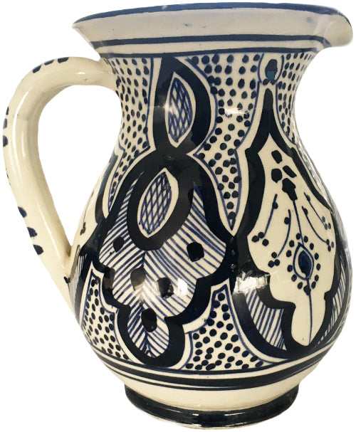 Jolie cruche à eau marocaine peinte en bleu et en faïence émaillée. Fabriquée à la main dans un style marocain... En savoir plus