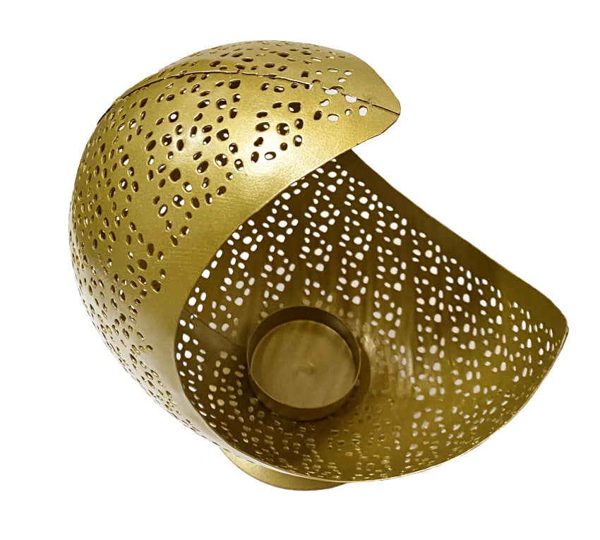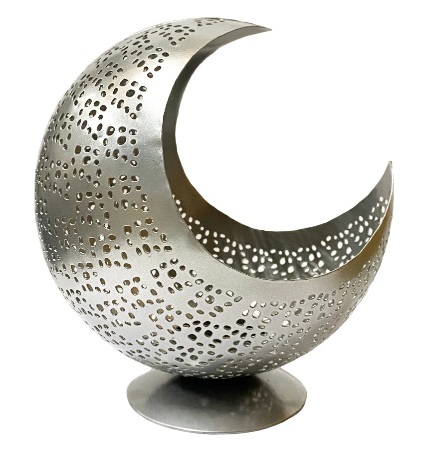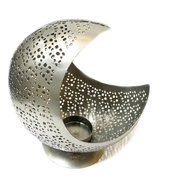 Beau photophore lune fait à la main avec des trous à travers lesquels une lumière scintillante se reflète sur les... En savoir plus